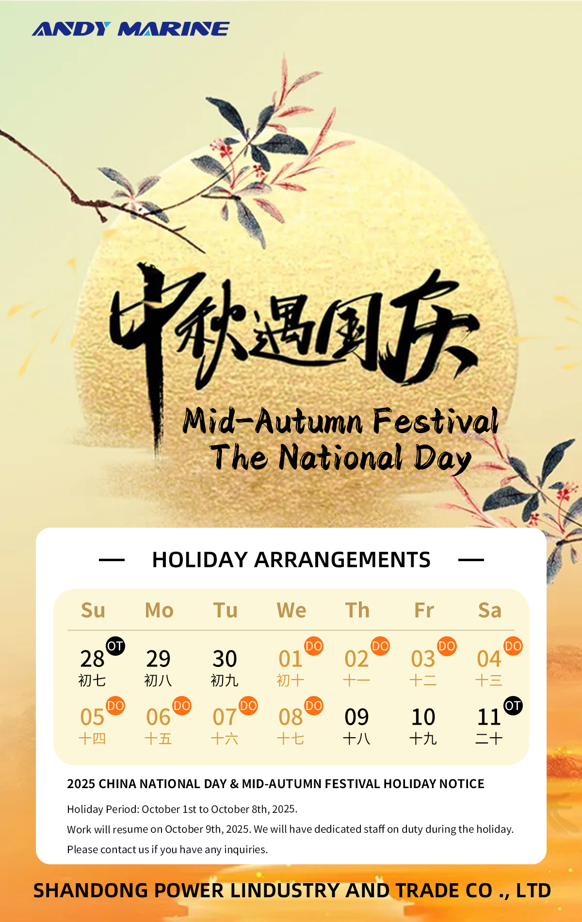 The National Day of China in 2025 is approaching. All the staff of Andy Marine extend our most sincere festival greetings to you! Thank you for your long-term trust and support. This National Day holiday also includes the traditional Chinese festival, the Mid-Autumn Festival. According to the regulations of Chinese legal holidays and in light of the actual situation of our company, the holiday arrangements are as follows: